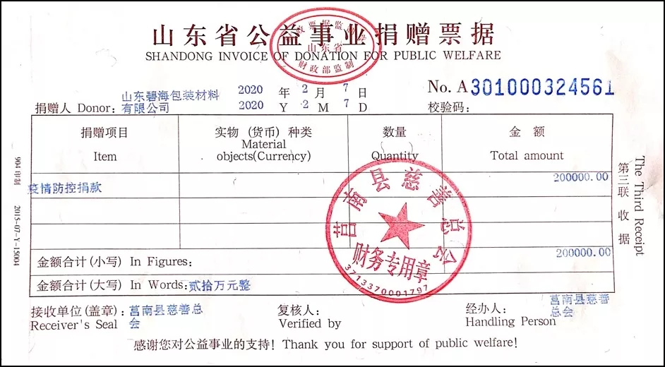 近來(lái),新型冠狀病毒引起的肺炎疫情形勢(shì)嚴(yán)峻,時(shí)刻牽動(dòng)著全國(guó)人民的心。共抗疫情,責(zé)任在肩,山東碧海包裝材料有限公司為了積極助力疫情防控,于2020年2月7日捐款人民幣20萬(wàn)元,馳援抗擊疫情,所捐款項(xiàng)將用于抗擊新型冠狀病毒肺炎疫情。